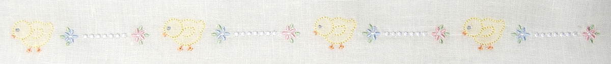 The Baby Chicks and Granitos Horizontal machine embroidery designs are excerpted from the Baby Chicks & Bows Collection by Kathy Drew. Choose from two versions: The insertion (four motifs) design is 12.19 x .70 inches and fits a 9.5 x 14 hoop, while the single motif design is 3.01 x .70 inches and fits a 4×4 hoop. The files will be available to download immediately on your order confirmation page. They can also be downloaded anytime through your Sewing Collection account. Log in to your account and then click on Individual Downloads to access.