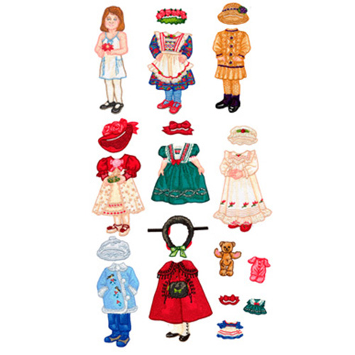 This paper doll machine embroidery collection includes boy and girl designs, each complete with an adorable wardrobe and accessories.