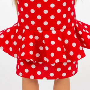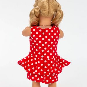 Pairing red polka dots with a sassy gathered peplum, this cute doll dress is sure to make you smile! The sleeveless straight dress features the bias peplum as the focal point of this outfit. The dress fits most popular 18″ dolls.