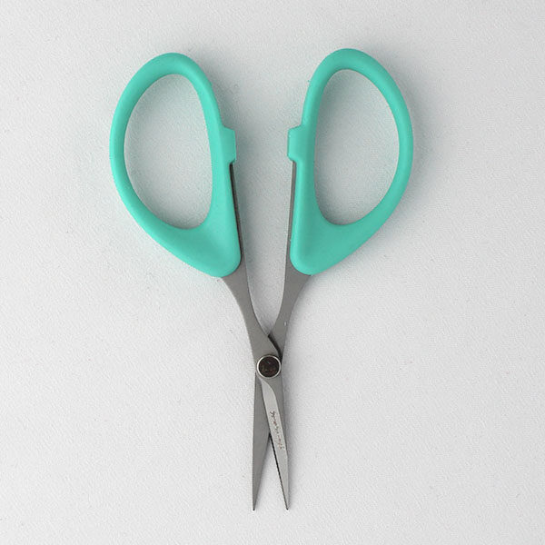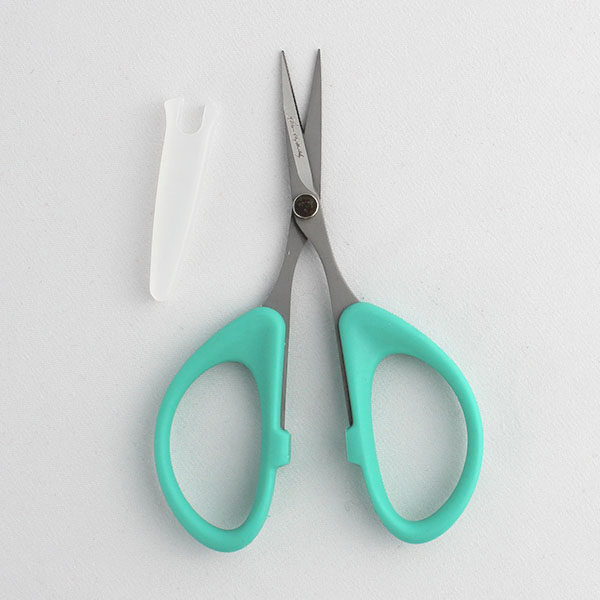 These Karen Kay Buckley Perfect Multi-Purpose Scissors are a small size with teal handles. The straight blade, stainless steel scissors are perfect for cutting templates (freezer paper, template plastic), fabric, and fabric with fusible stabilizers. The comfortable handles have the same soft, ergonomic grip as Karen Kay Buckley’s other Perfect Scissorsâ„¢. They cut sharp to the point and come with a plastic protective cover. Great for both right- and left-handed cutting.