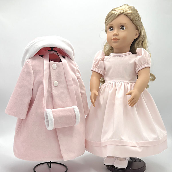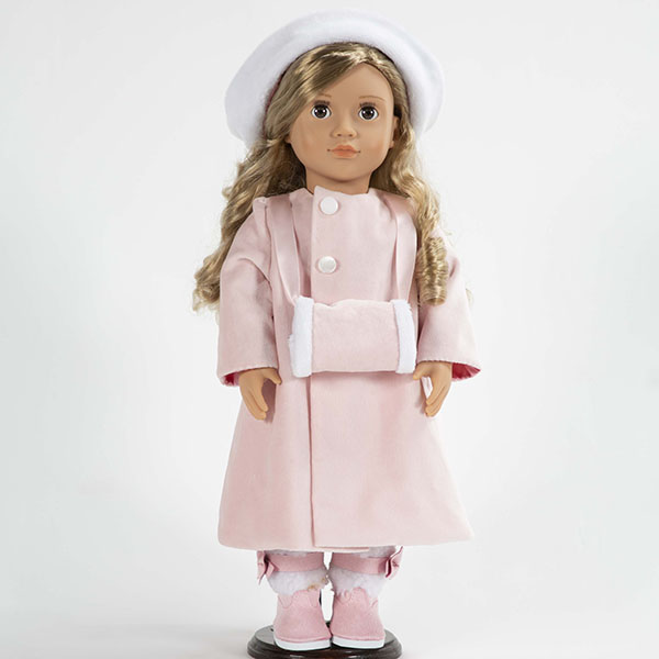 Step into a winter wonderland with this chic ensemble for your doll, designed by Alicia Welcher and featured in the 2023 Doll Club collection. The set includes a dress, a coat, a cozy hat, and a cute muff. Your doll will be the belle of the winter ball in this delightful set!