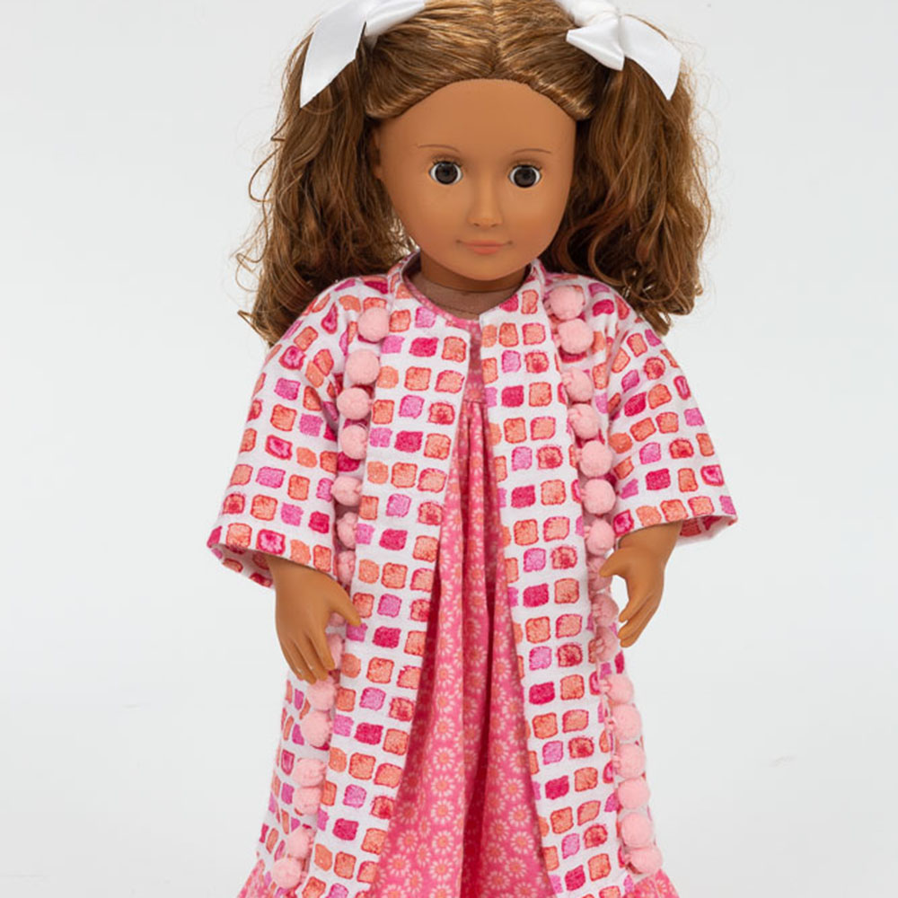 Connie Palmer has created an adorable robe with pom-poms inserted in the front seams. The robe was designed to pair with the Sleepover Nightgown where the robe length falls just above the gown ruffle. Coordinating fabrics make for the perfect set!